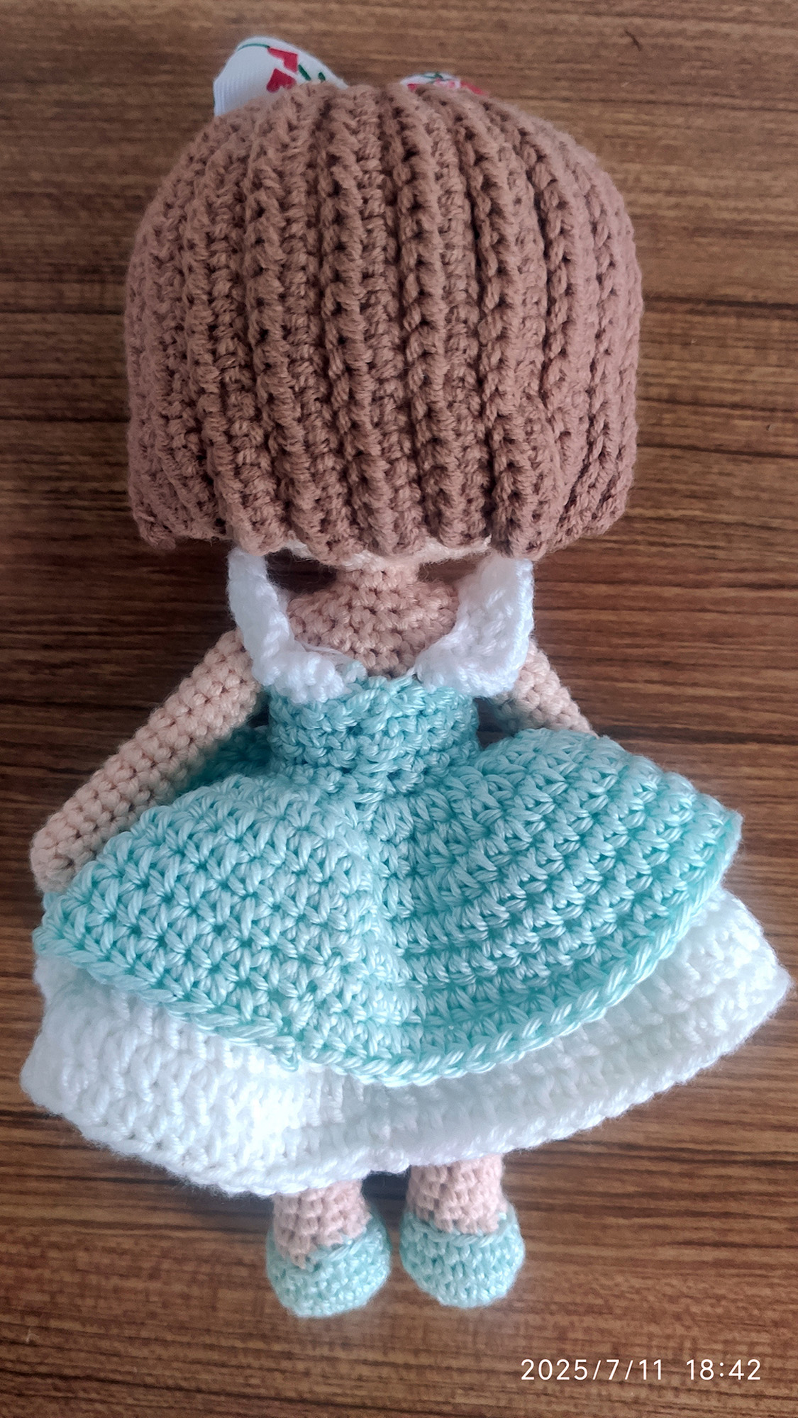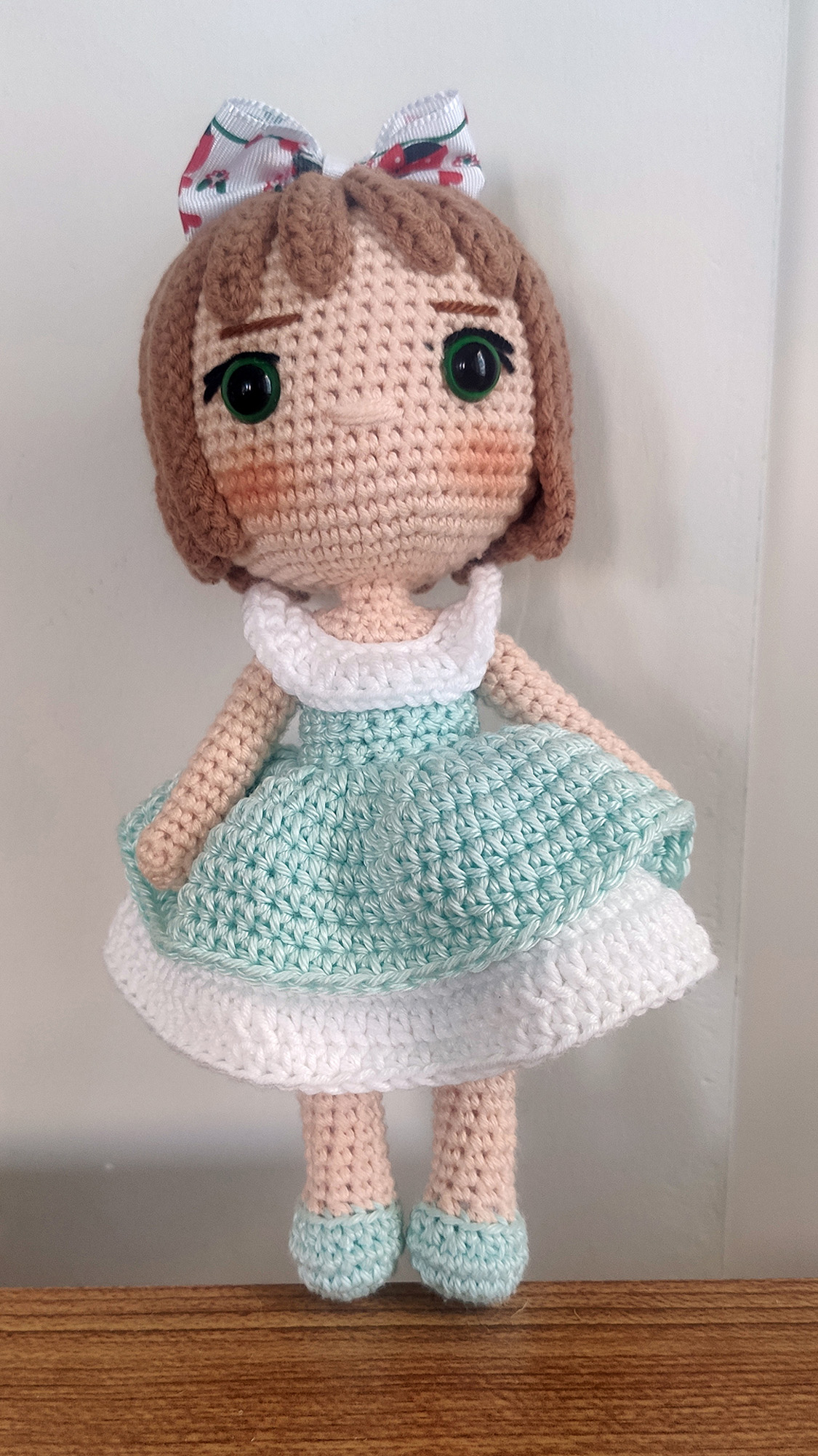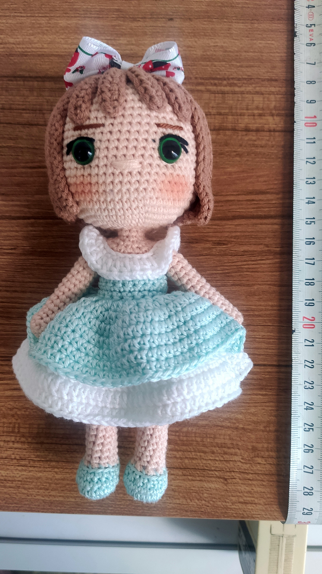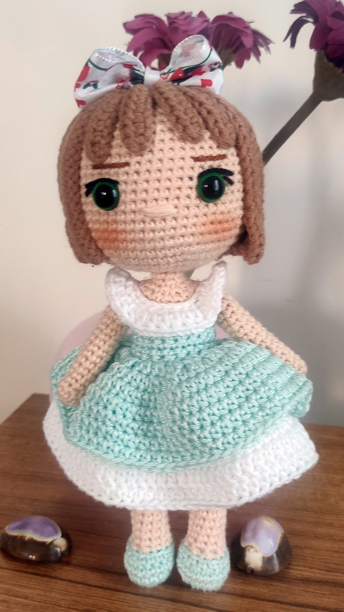 Tatlı bir yaz esintisi ve nostaljik bir sevimlilikle tanışın! Bu el yapımı amigurumi bebek, küt kesim kahverengi saçları, desenli fiyonk tokası ve nane yeşili katlı elbisesiyle en güzel anılarınızı canlandırmak için tasarlandı. Her ilmeğinde sevgi ve özen bulunan bu bebek, harika bir oyun arkadaşı ve odanızın en tatlı dekoru olacak.