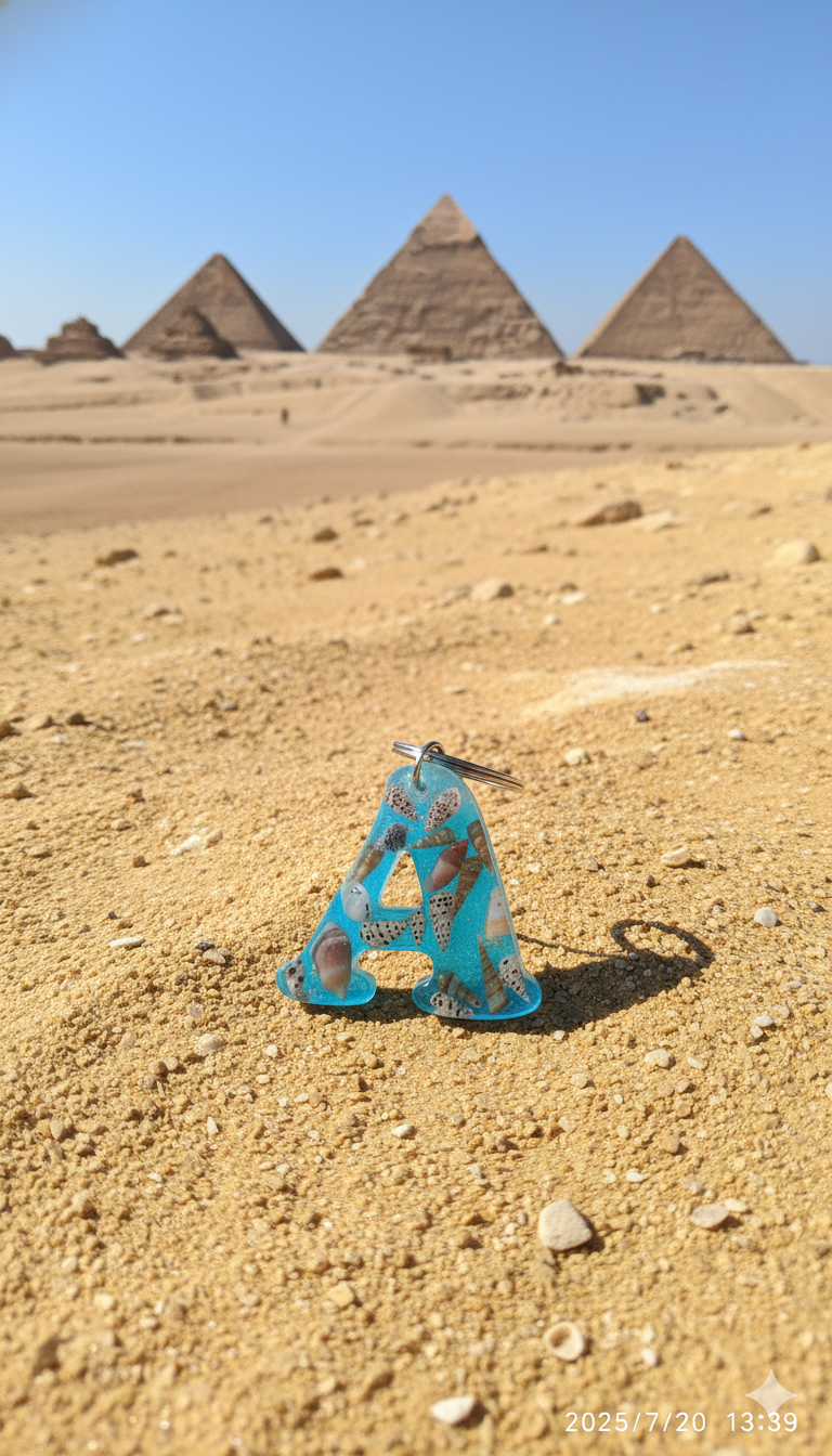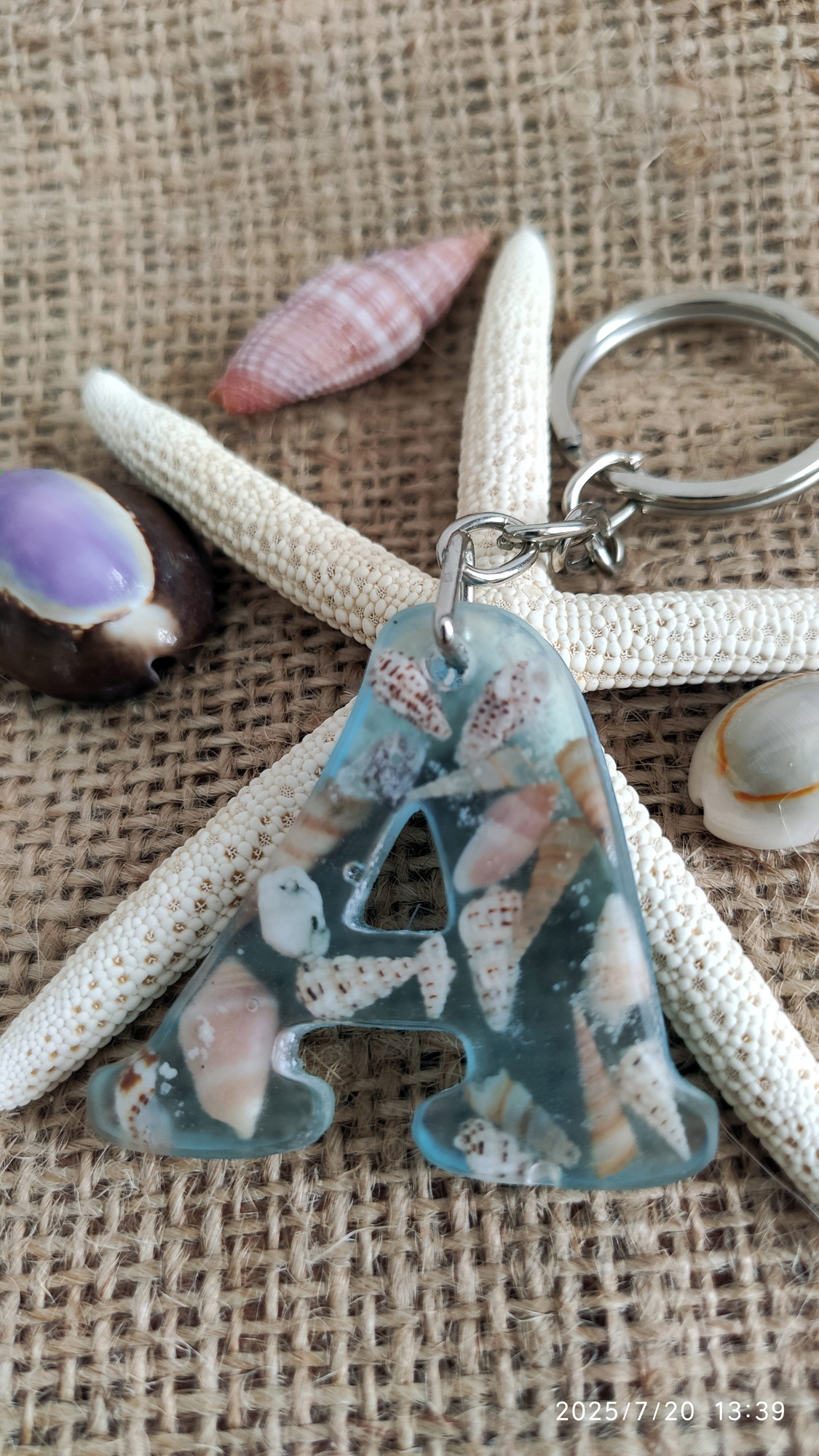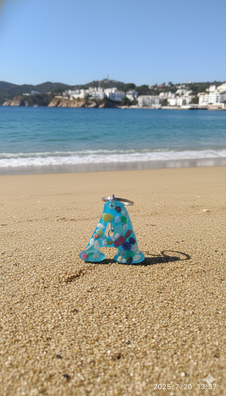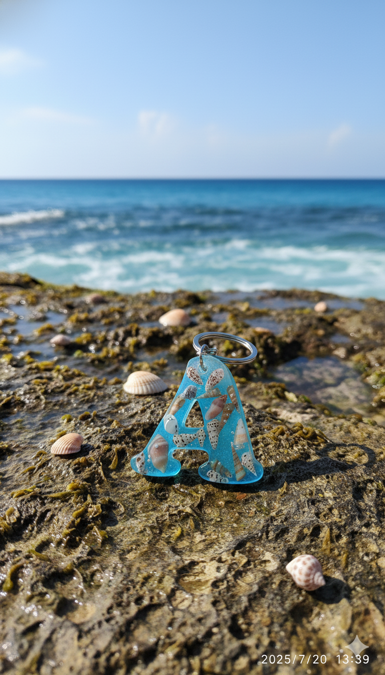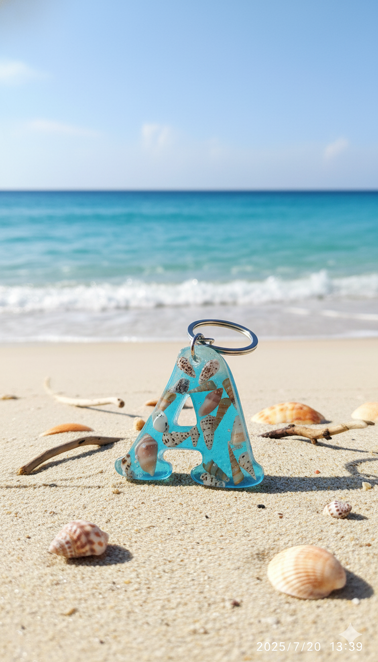 Bu seri, açık mavi pigmentle renklendirilmiş UV dirençli epoksi içinde gerçek minyatür deniz kabukları ve ince sahil kumu kullanılarak tek tek elde üretilir. Her harf dökümden önce kompozisyon olarak hazırlanır; kabarcık kontrolü yapılarak dökülür, kürünü tamamladıktan sonra ıslak zımpara → parlatma aşamalarından geçer. Sonuç; cam berraklığında, pürüzsüz ve sağlam bir sahil temalı anahtarlık.