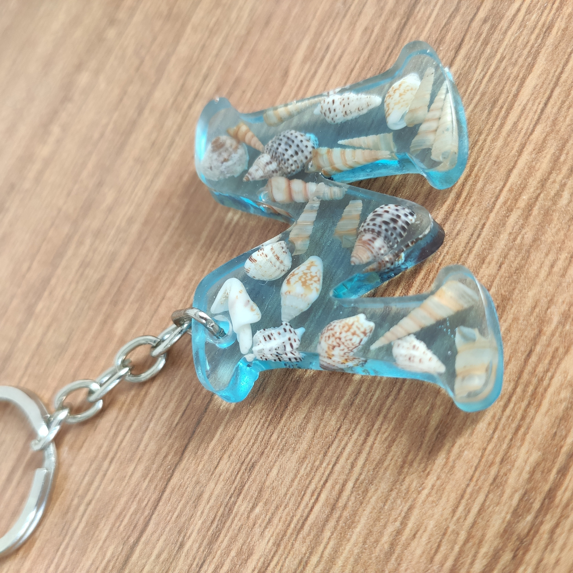 Bu seri, açık mavi pigmentle renklendirilmiş UV dirençli epoksi içinde gerçek minyatür deniz kabukları ve ince sahil kumu kullanılarak tek tek elde üretilir. Her harf dökümden önce kompozisyon olarak hazırlanır; kabarcık kontrolü yapılarak dökülür, kürünü tamamladıktan sonra ıslak zımpara → parlatma aşamalarından geçer. Sonuç; cam berraklığında, pürüzsüz ve sağlam bir sahil temalı anahtarlık.