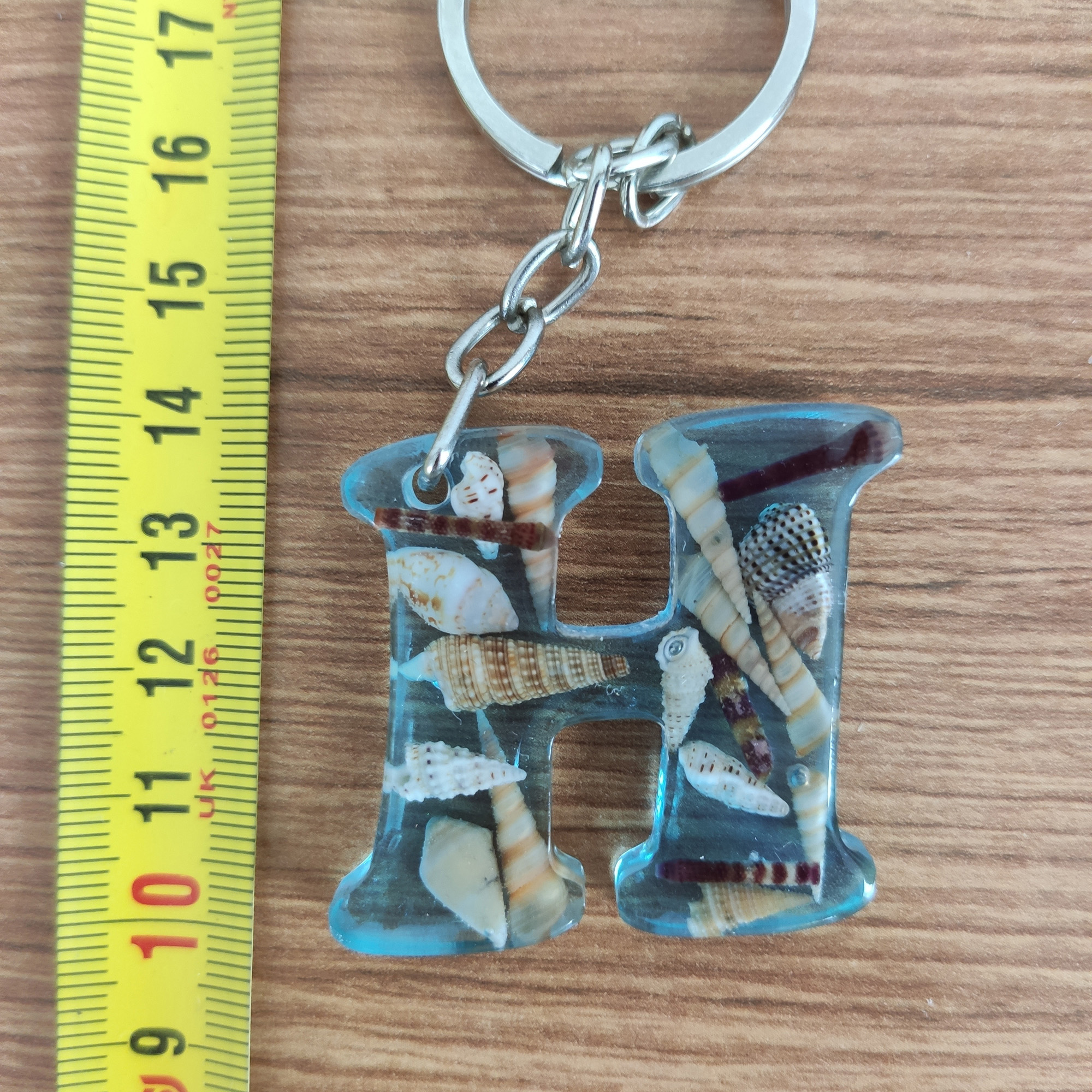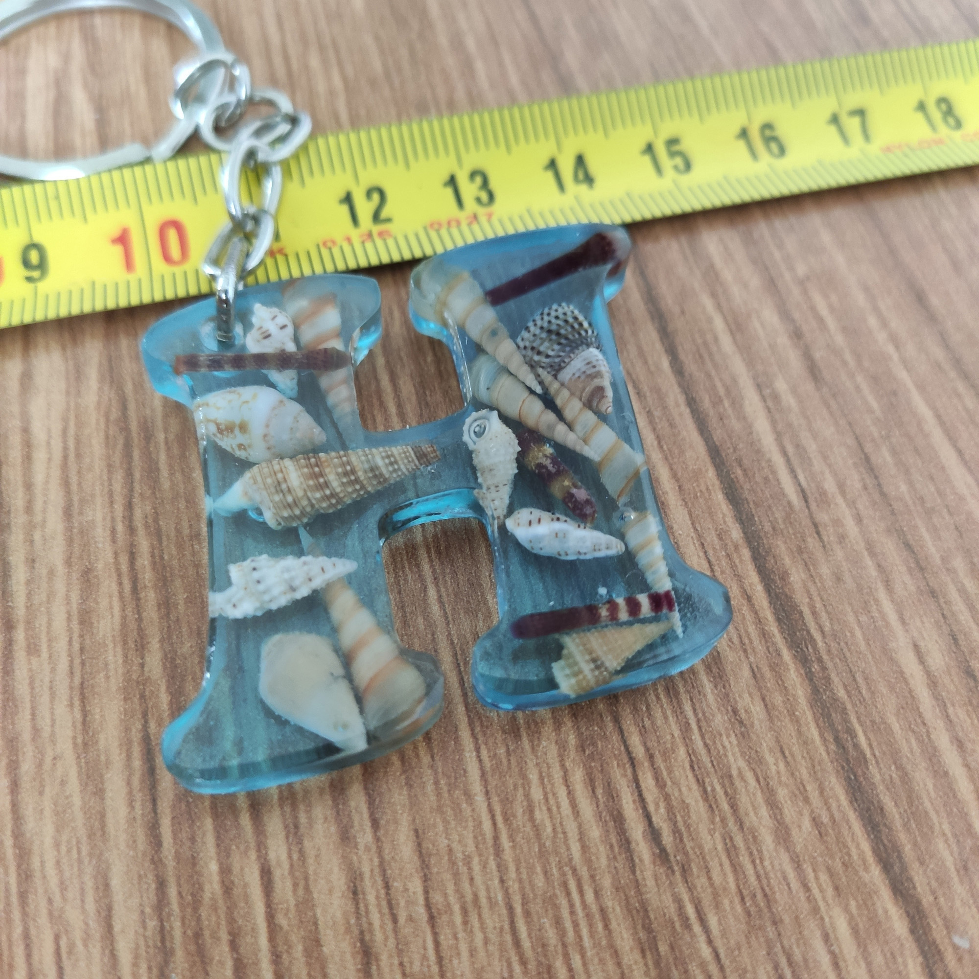 Bu seri, açık mavi pigmentle renklendirilmiş UV dirençli epoksi içinde gerçek minyatür deniz kabukları ve ince sahil kumu kullanılarak tek tek elde üretilir. Her harf dökümden önce kompozisyon olarak hazırlanır; kabarcık kontrolü yapılarak dökülür, kürünü tamamladıktan sonra ıslak zımpara → parlatma aşamalarından geçer. Sonuç; cam berraklığında, pürüzsüz ve sağlam bir sahil temalı anahtarlık.
