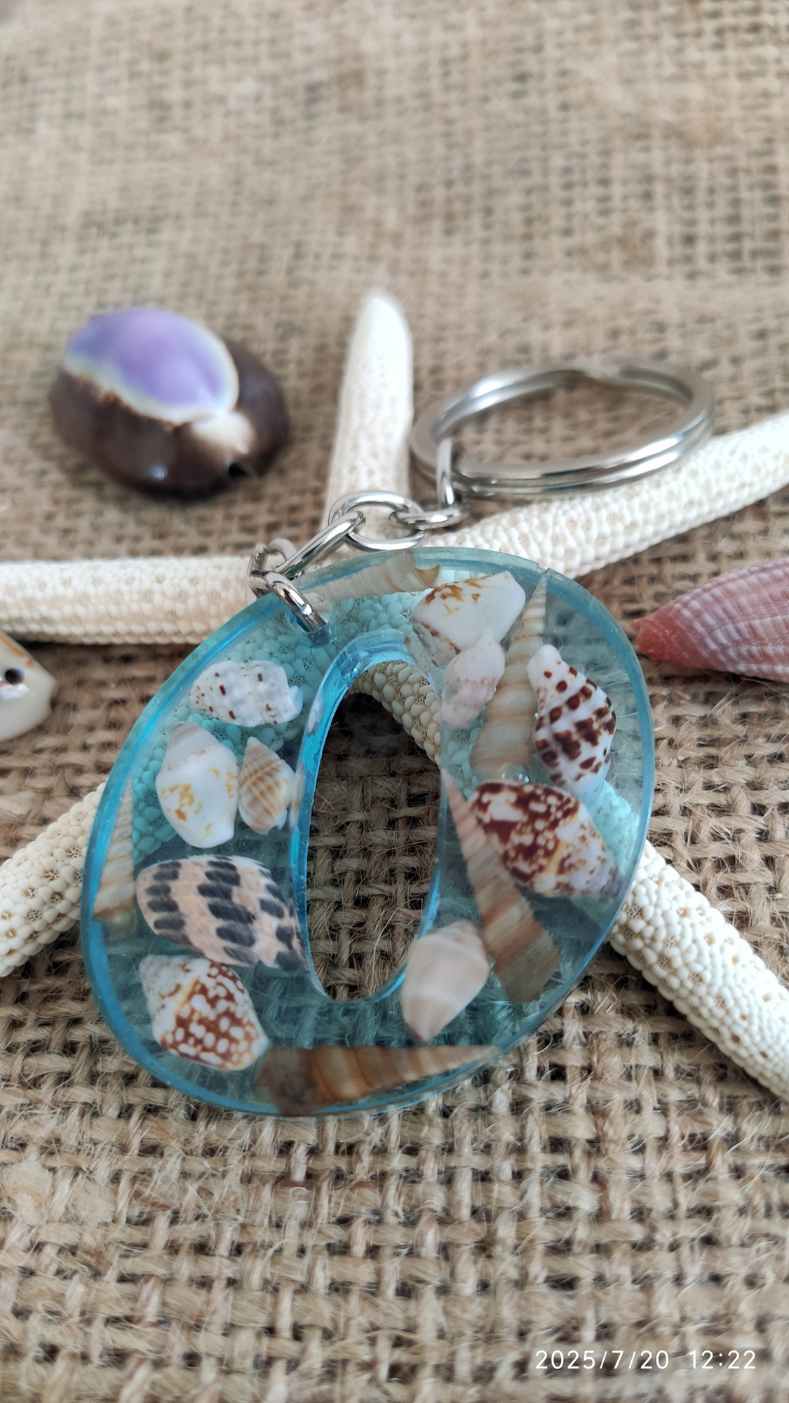 Bu seri, açık mavi pigmentle renklendirilmiş UV dirençli epoksi içinde gerçek minyatür deniz kabukları ve ince sahil kumu kullanılarak tek tek elde üretilir. Her harf dökümden önce kompozisyon olarak hazırlanır; kabarcık kontrolü yapılarak dökülür, kürünü tamamladıktan sonra ıslak zımpara → parlatma aşamalarından geçer. Sonuç; cam berraklığında, pürüzsüz ve sağlam bir sahil temalı anahtarlık.