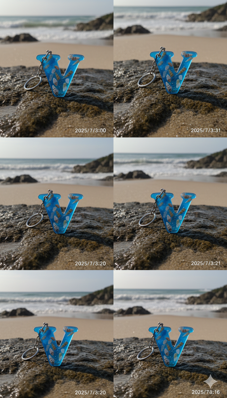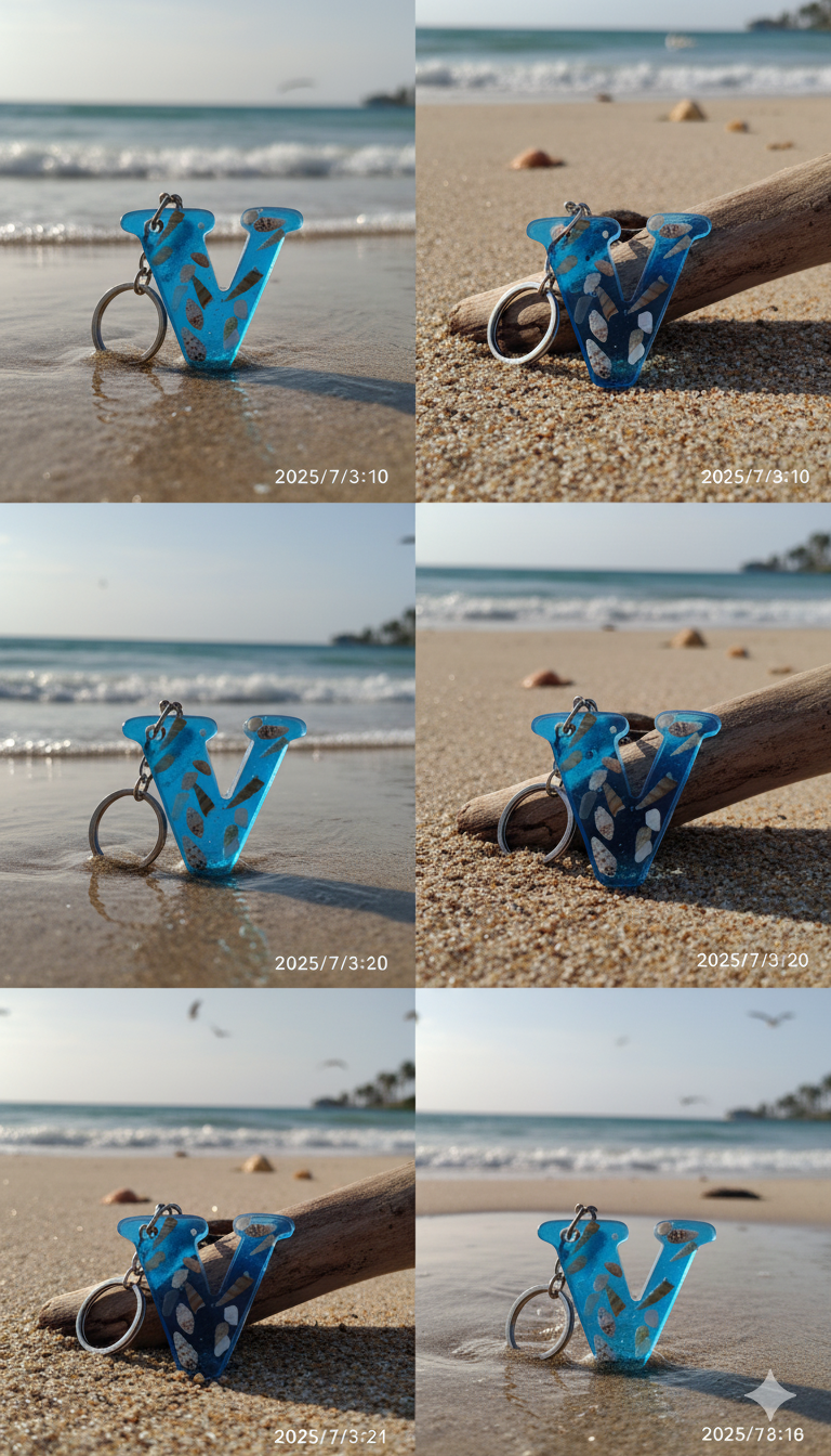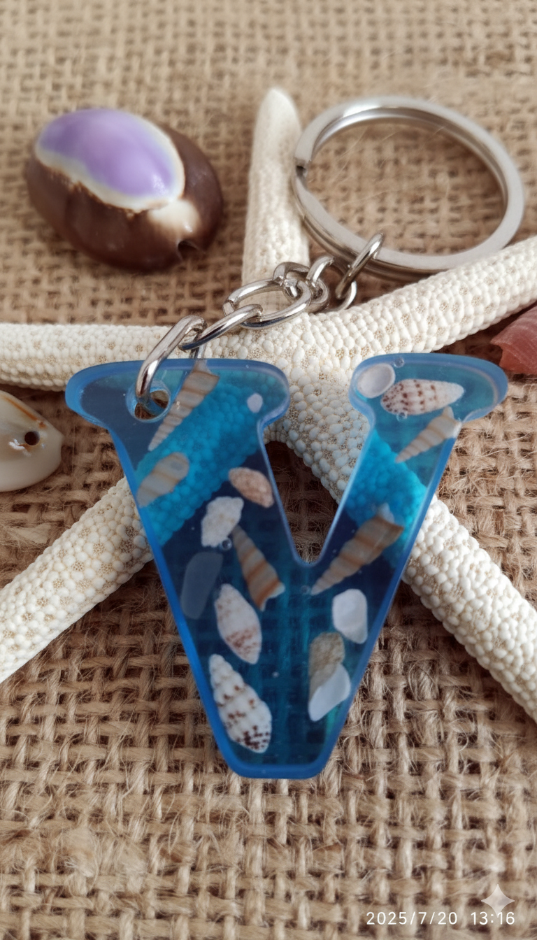 Bu seri, açık mavi pigmentle renklendirilmiş UV dirençli epoksi içinde gerçek minyatür deniz kabukları ve ince sahil kumu kullanılarak tek tek elde üretilir. Her harf dökümden önce kompozisyon olarak hazırlanır; kabarcık kontrolü yapılarak dökülür, kürünü tamamladıktan sonra ıslak zımpara → parlatma aşamalarından geçer. Sonuç; cam berraklığında, pürüzsüz ve sağlam bir sahil temalı anahtarlık.
