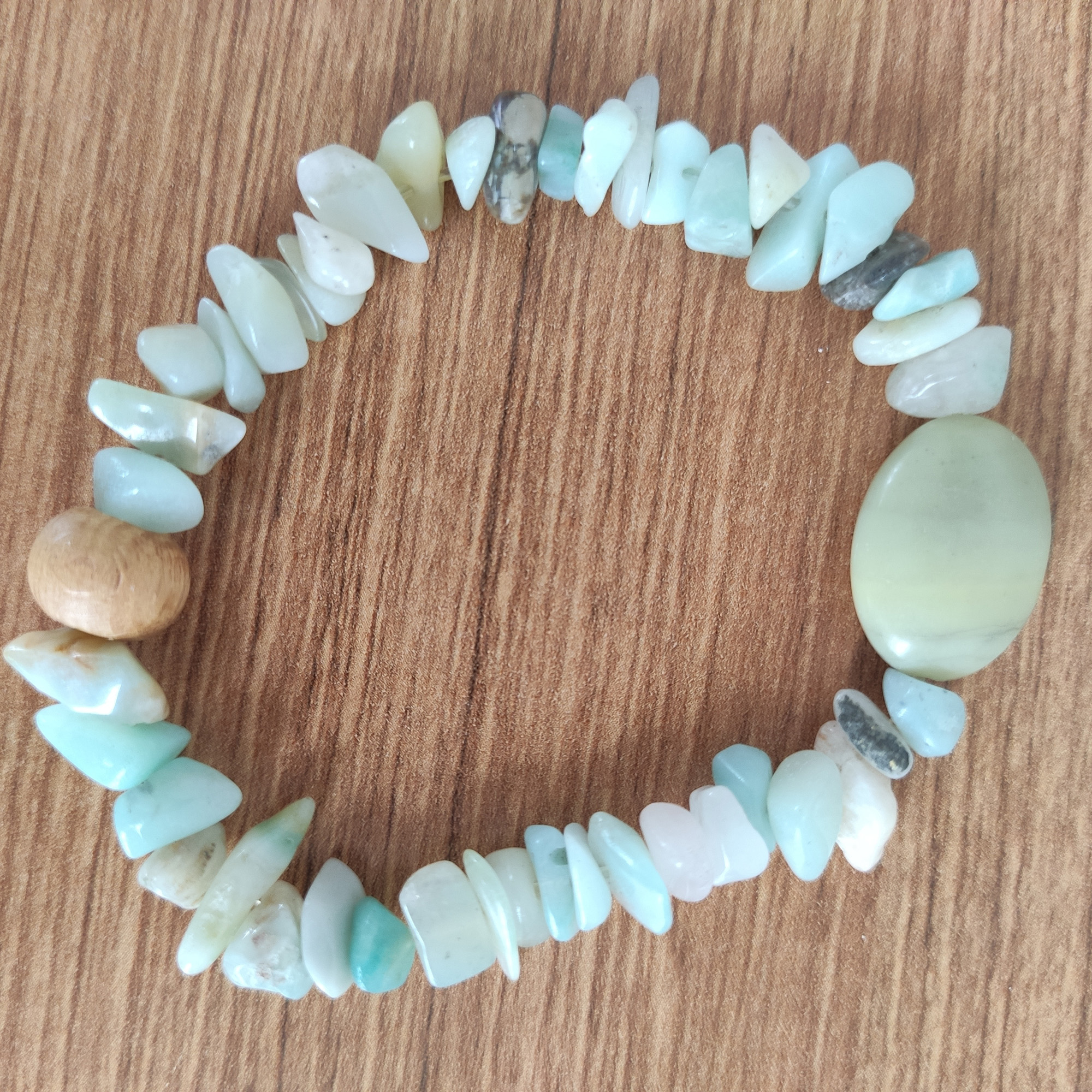 Amazonite, potasyum feldspar mineralinin bir türü olan mikroklindir ve kendine özgü mavi-yeşil tonu, içindeki kurşun ve su moleküllerinden kaynaklanır. Bu taş, genellikle düzensiz çipler veya cilalı boncuklar halinde işlenerek bileklik, kolye ve küpe gibi takılarda kullanılır. Çıkarıldığı başlıca bölgeler arasında Rusya’nın Ural Dağları, ABD’nin Colorado eyaleti, Brezilya, Madagaskar, Hindistan, Etiyopya, Avustralya ve Namibya yer alır. İsmi Amazon Nehri’nden esinlense de, bu nehir havzasında bulunmaz; adı 19. yüzyılda Avrupalı kaşifler tarafından bir yanılgı sonucu verilmiştir. Taşın doğal varyasyonları, her bir bilekliğin eşsiz bir görsellik sunmasını sağlar, bu da onu el yapımı mücevherler için popüler bir seçim haline getirir.