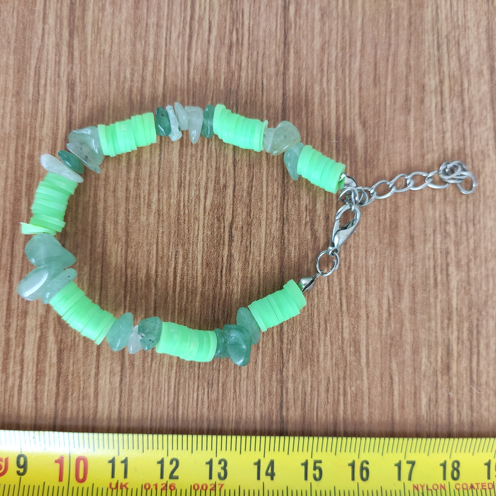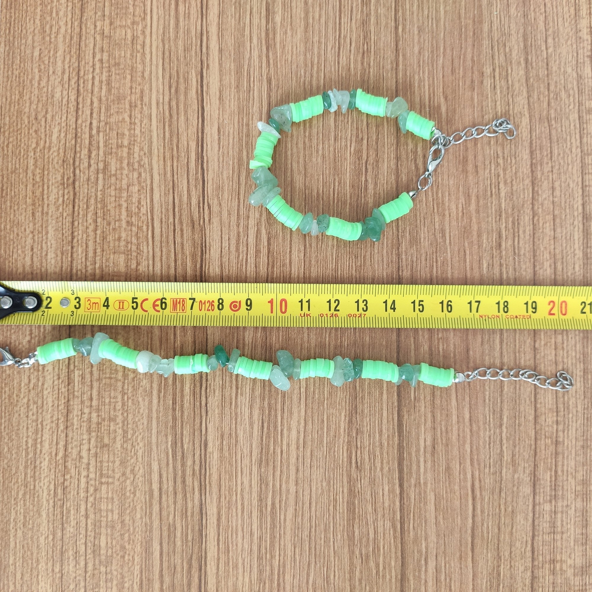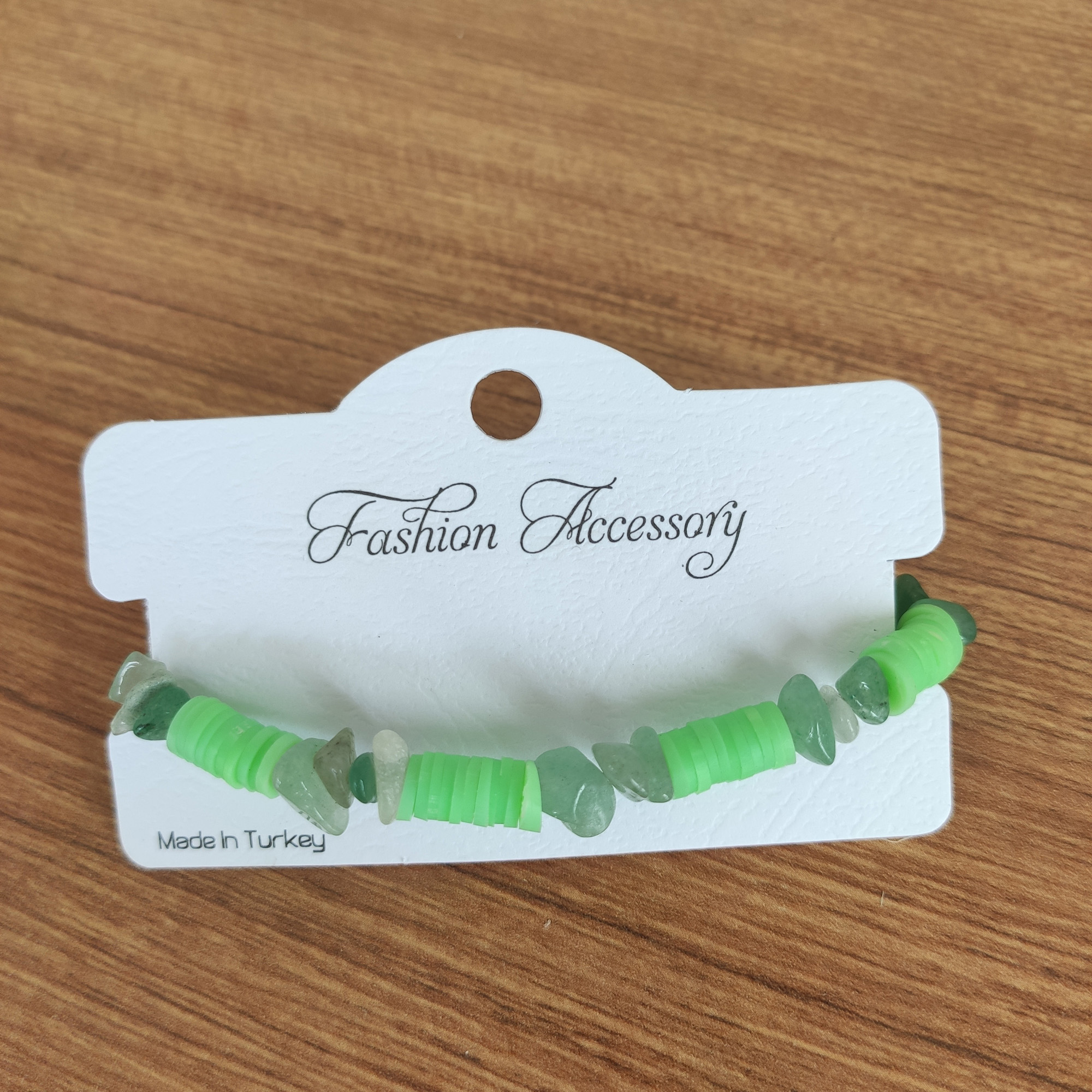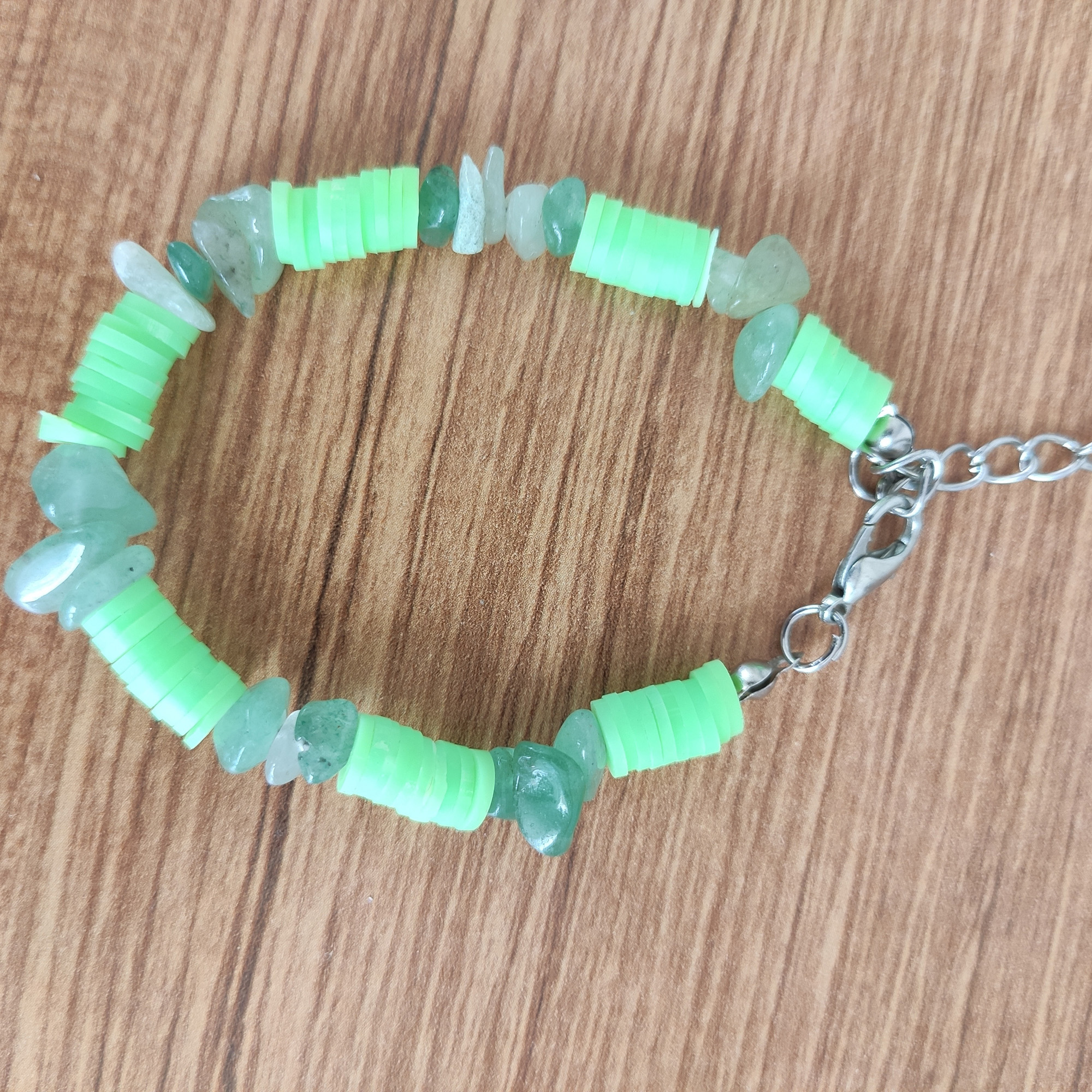 El yapımı bu bileklik, doğanın enerjisini yansıtan yeşil aventurin taşları ile modern heishi boncukların birleşiminden oluşuyor. Aventurin taşı, huzur ve denge sembolü olarak bilinirken, neon yeşil heishi boncuklar tasarıma genç, dinamik ve yazlık bir hava katıyor.