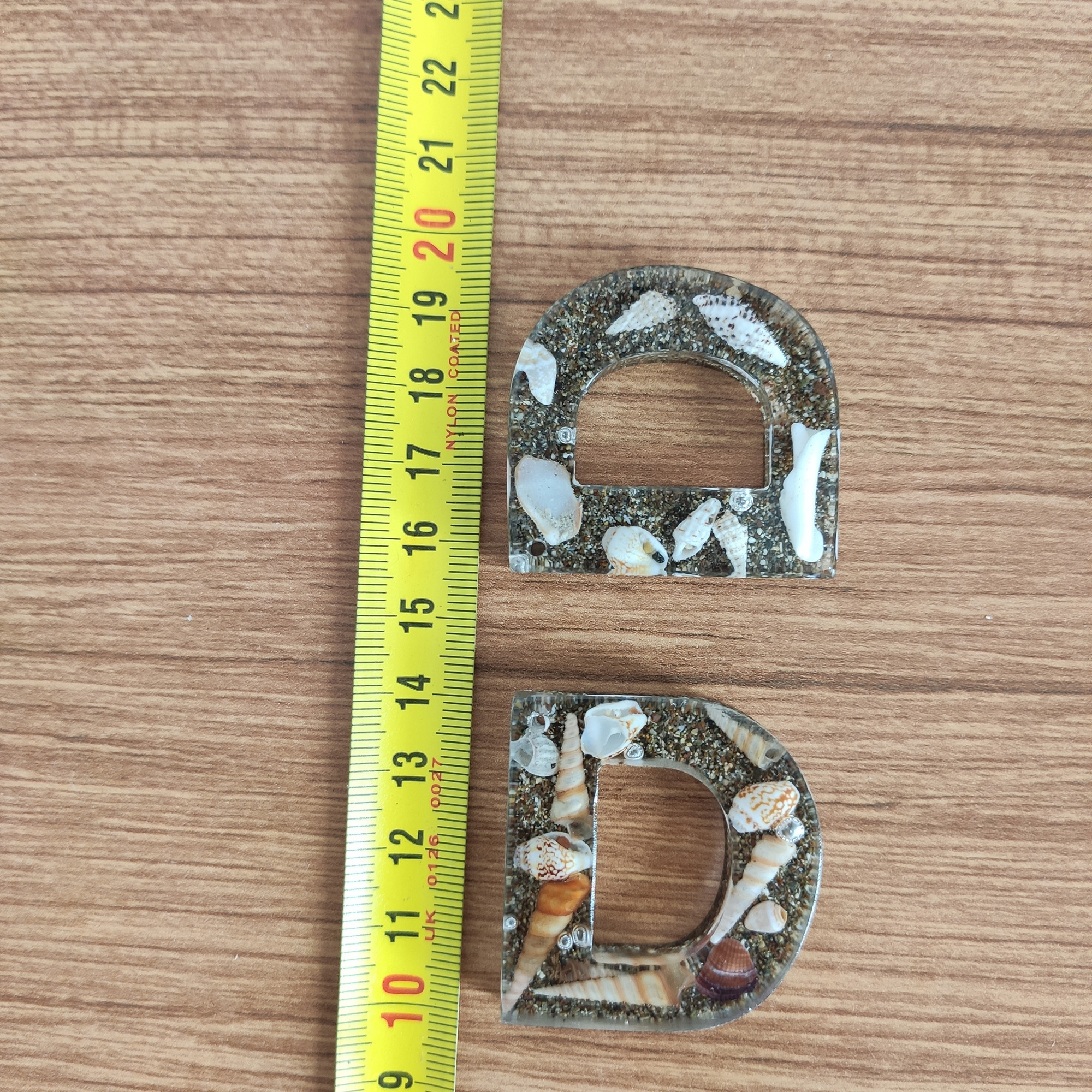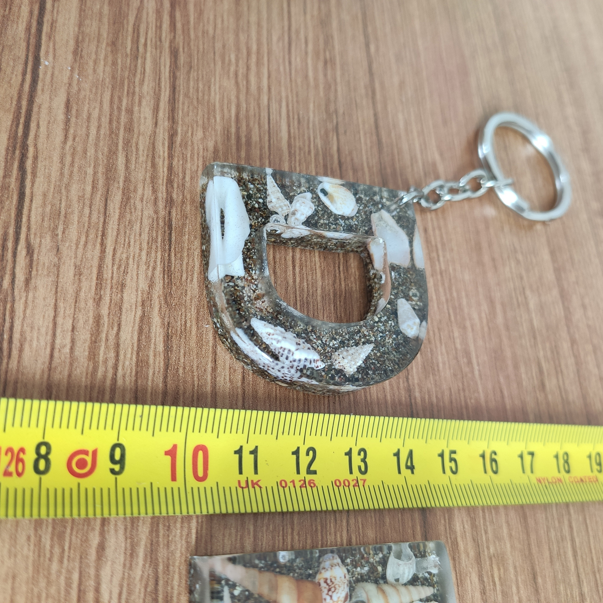 Bu anahtarlıkta, şeffaf epoksi reçinenin içinde gerçek deniz kabukları ve ince kum katmanları, adınızın/baş harfinizin formunda (A–Z) özenle kompoze edilir. Her parça tek kalıpta ve tek döküm yöntemiyle hazırlanır; döküm sonrası kademeli zımpara + parlatma yapılır ve metal aksamı elle monte edilir.