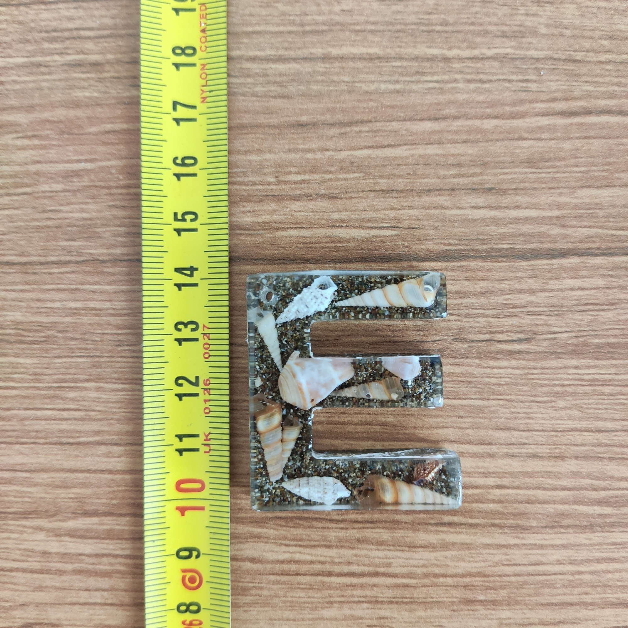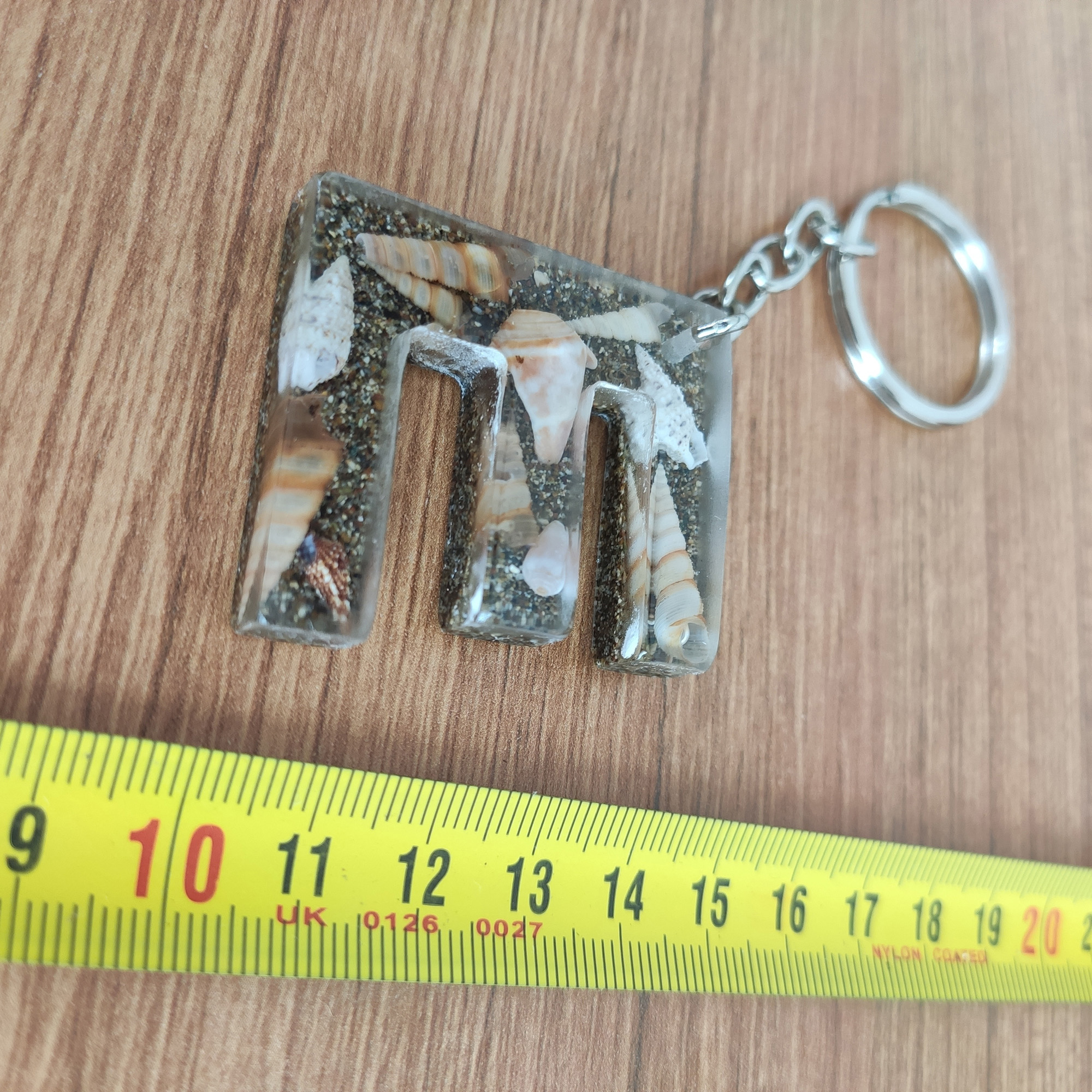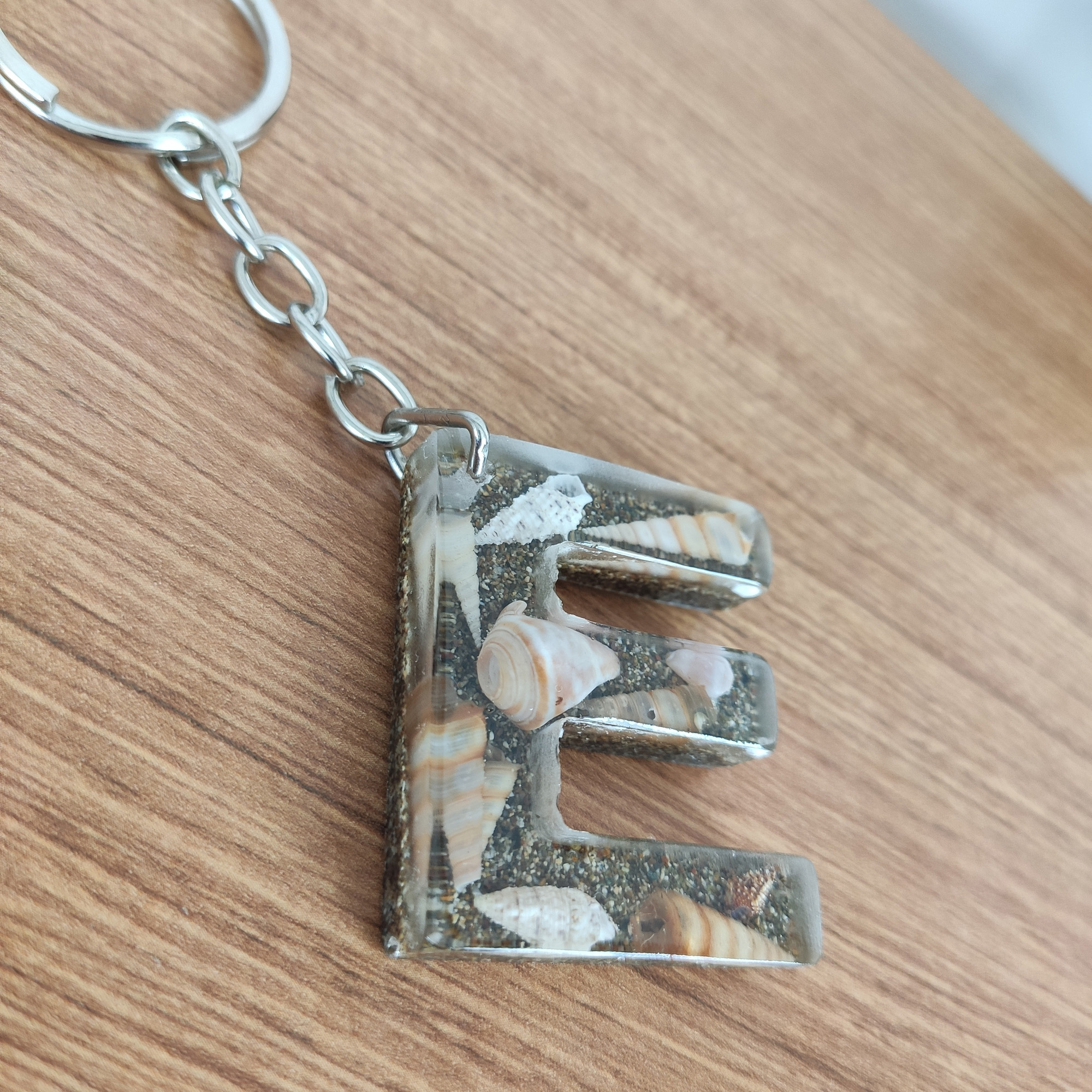 Bu anahtarlıkta, şeffaf epoksi reçinenin içinde gerçek deniz kabukları ve ince kum katmanları, adınızın/baş harfinizin formunda (A–Z) özenle kompoze edilir. Her parça tek kalıpta ve tek döküm yöntemiyle hazırlanır; döküm sonrası kademeli zımpara + parlatma yapılır ve metal aksamı elle monte edilir.