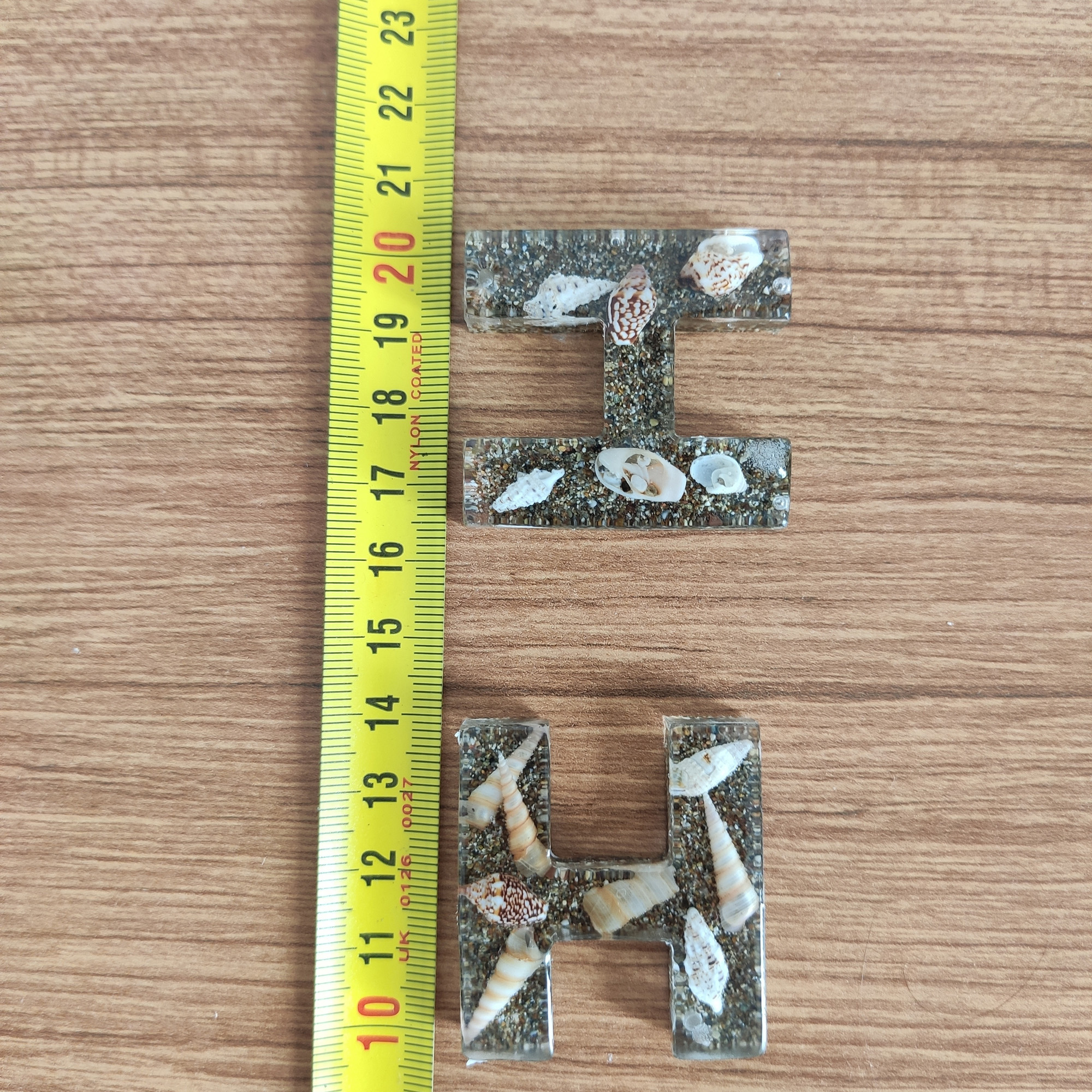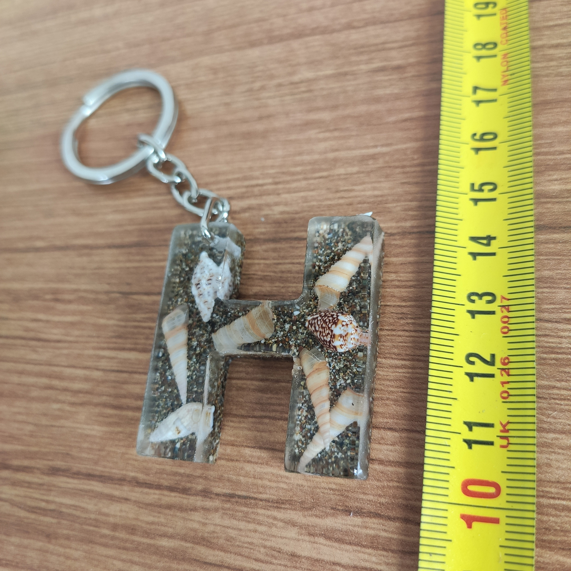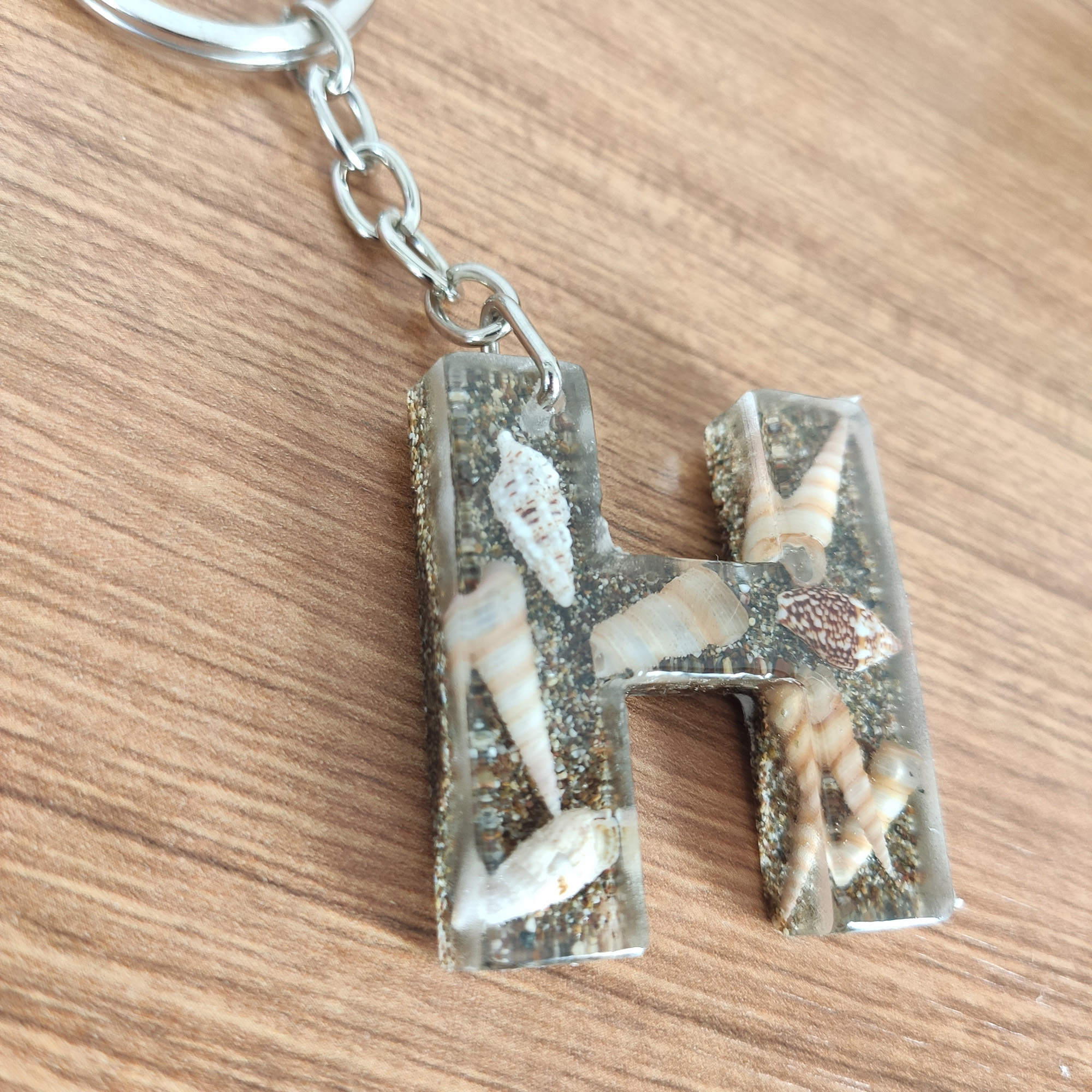 Bu anahtarlıkta, şeffaf epoksi reçinenin içinde gerçek deniz kabukları ve ince kum katmanları, adınızın/baş harfinizin formunda (A–Z) özenle kompoze edilir. Her parça tek kalıpta ve tek döküm yöntemiyle hazırlanır; döküm sonrası kademeli zımpara + parlatma yapılır ve metal aksamı elle monte edilir.