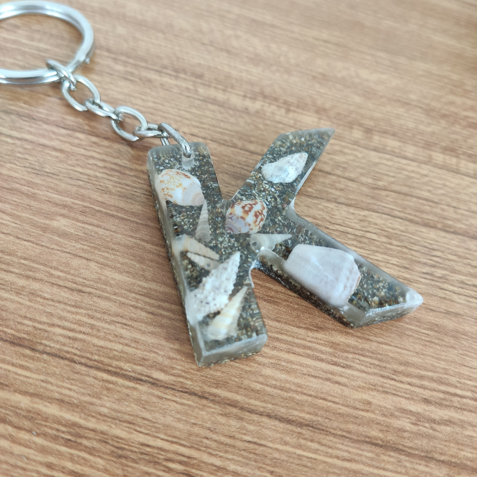 Bu anahtarlıkta, şeffaf epoksi reçinenin içinde gerçek deniz kabukları ve ince kum katmanları, adınızın/baş harfinizin formunda (A–Z) özenle kompoze edilir. Her parça tek kalıpta ve tek döküm yöntemiyle hazırlanır; döküm sonrası kademeli zımpara + parlatma yapılır ve metal aksamı elle monte edilir.