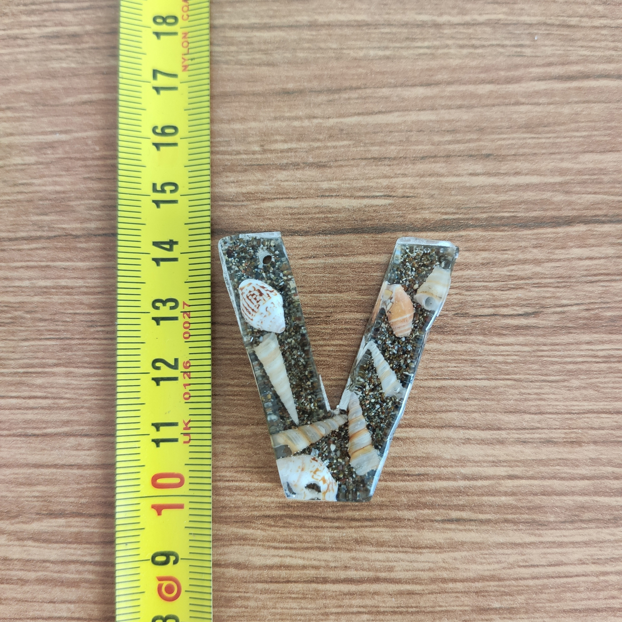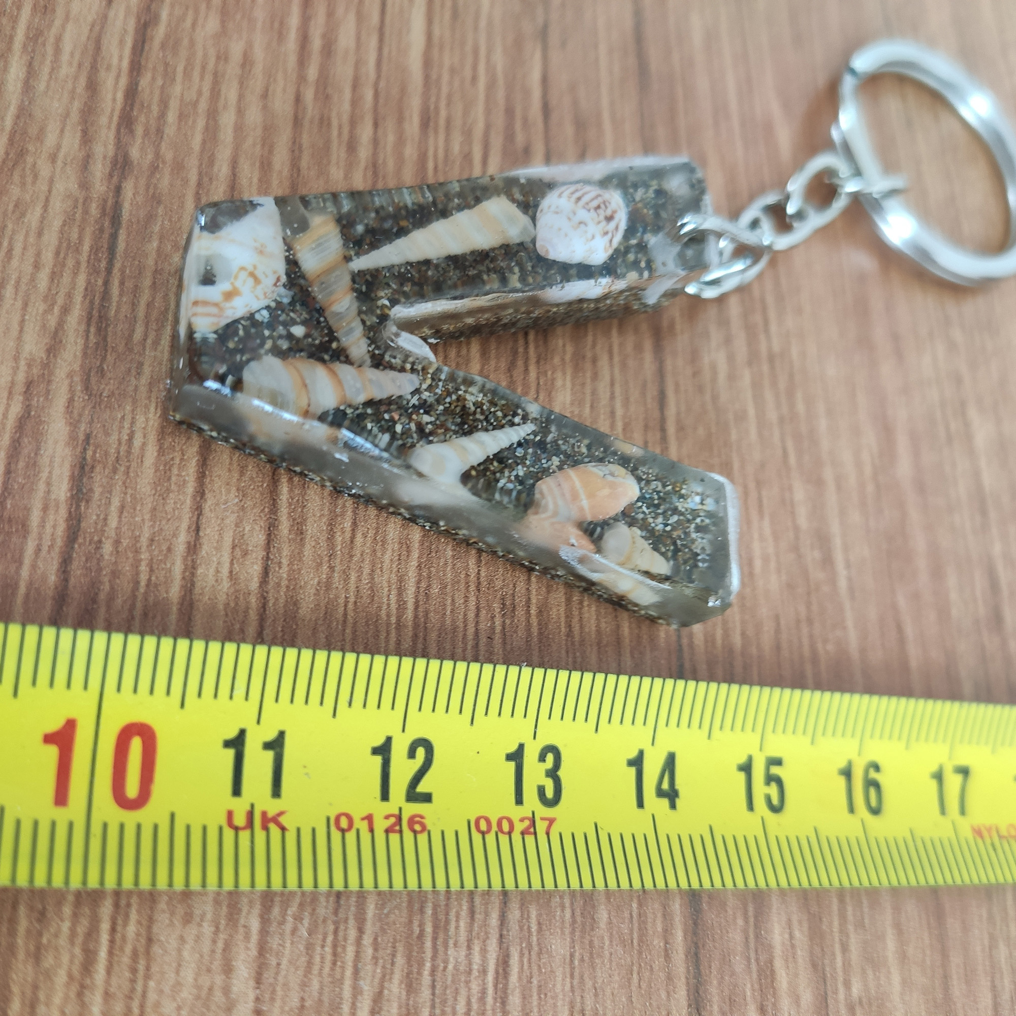Bu anahtarlıkta, şeffaf epoksi reçinenin içinde gerçek deniz kabukları ve ince kum katmanları, adınızın/baş harfinizin formunda (A–Z) özenle kompoze edilir. Her parça tek kalıpta ve tek döküm yöntemiyle hazırlanır; döküm sonrası kademeli zımpara + parlatma yapılır ve metal aksamı elle monte edilir.