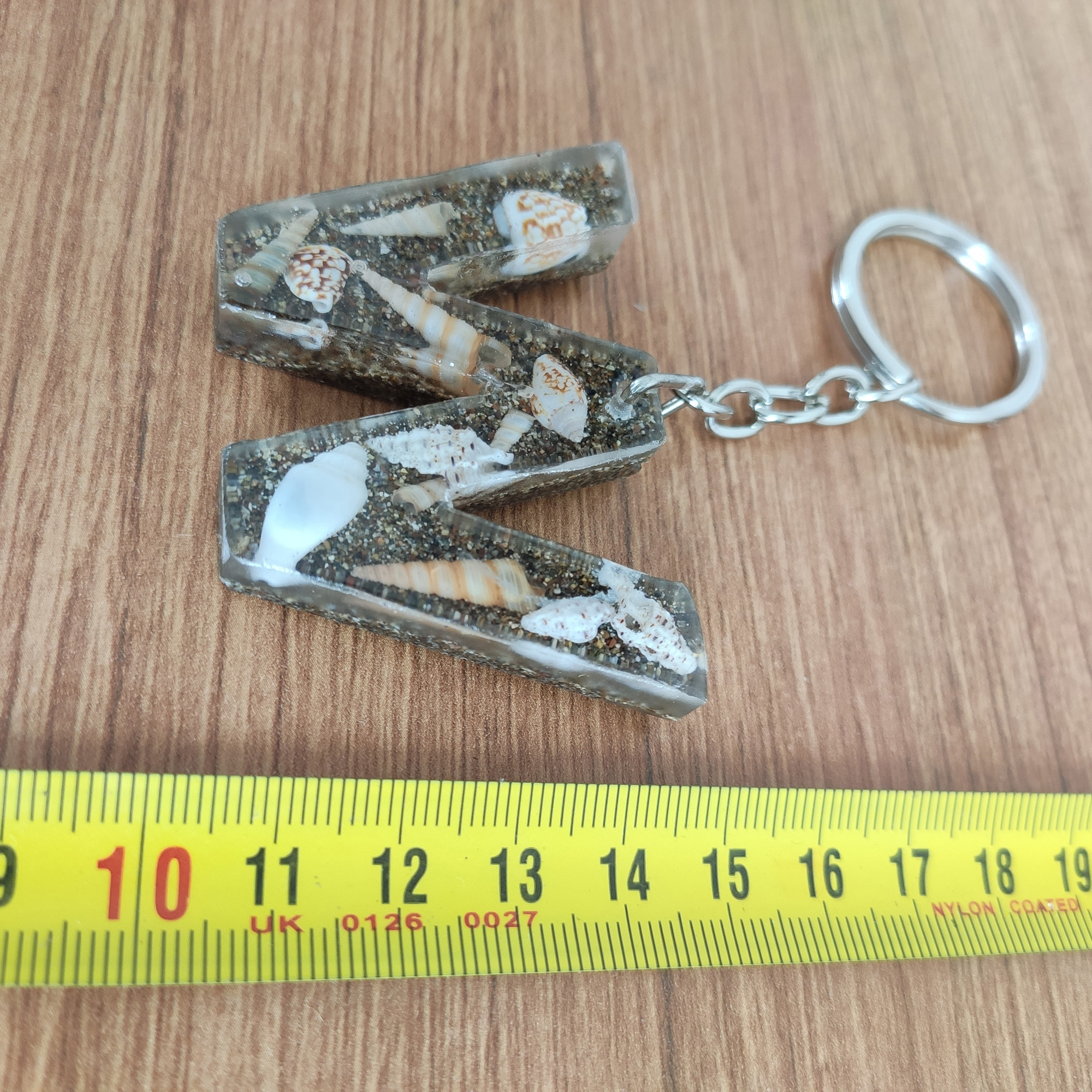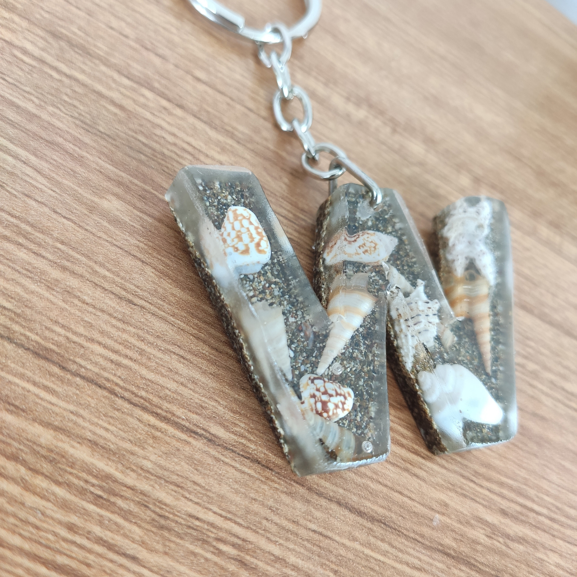 Bu anahtarlıkta, şeffaf epoksi reçinenin içinde gerçek deniz kabukları ve ince kum katmanları, adınızın/baş harfinizin formunda (A–Z) özenle kompoze edilir. Her parça tek kalıpta ve tek döküm yöntemiyle hazırlanır; döküm sonrası kademeli zımpara + parlatma yapılır ve metal aksamı elle monte edilir.