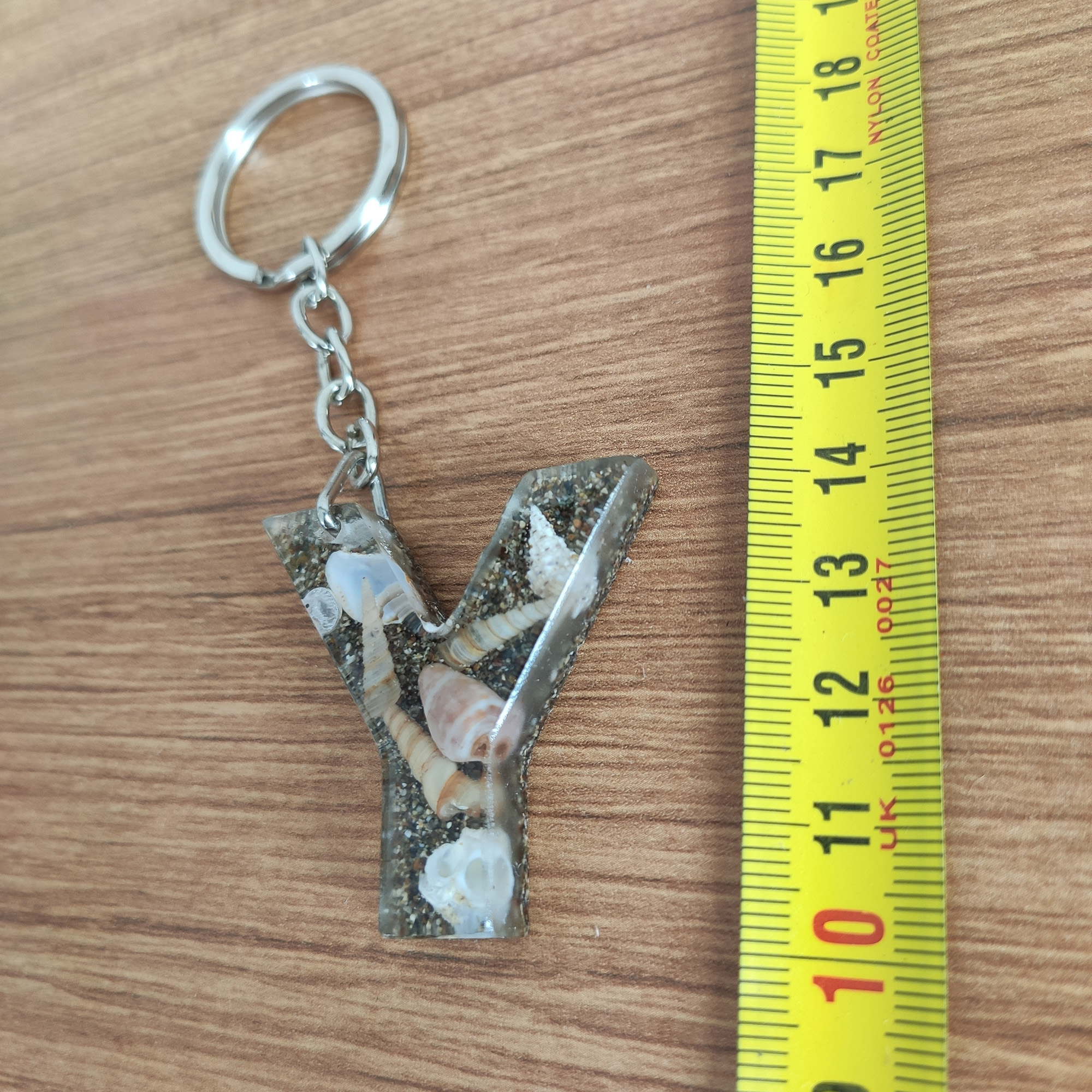 Bu anahtarlıkta, şeffaf epoksi reçinenin içinde gerçek deniz kabukları ve ince kum katmanları, adınızın/baş harfinizin formunda (A–Z) özenle kompoze edilir. Her parça tek kalıpta ve tek döküm yöntemiyle hazırlanır; döküm sonrası kademeli zımpara + parlatma yapılır ve metal aksamı elle monte edilir.