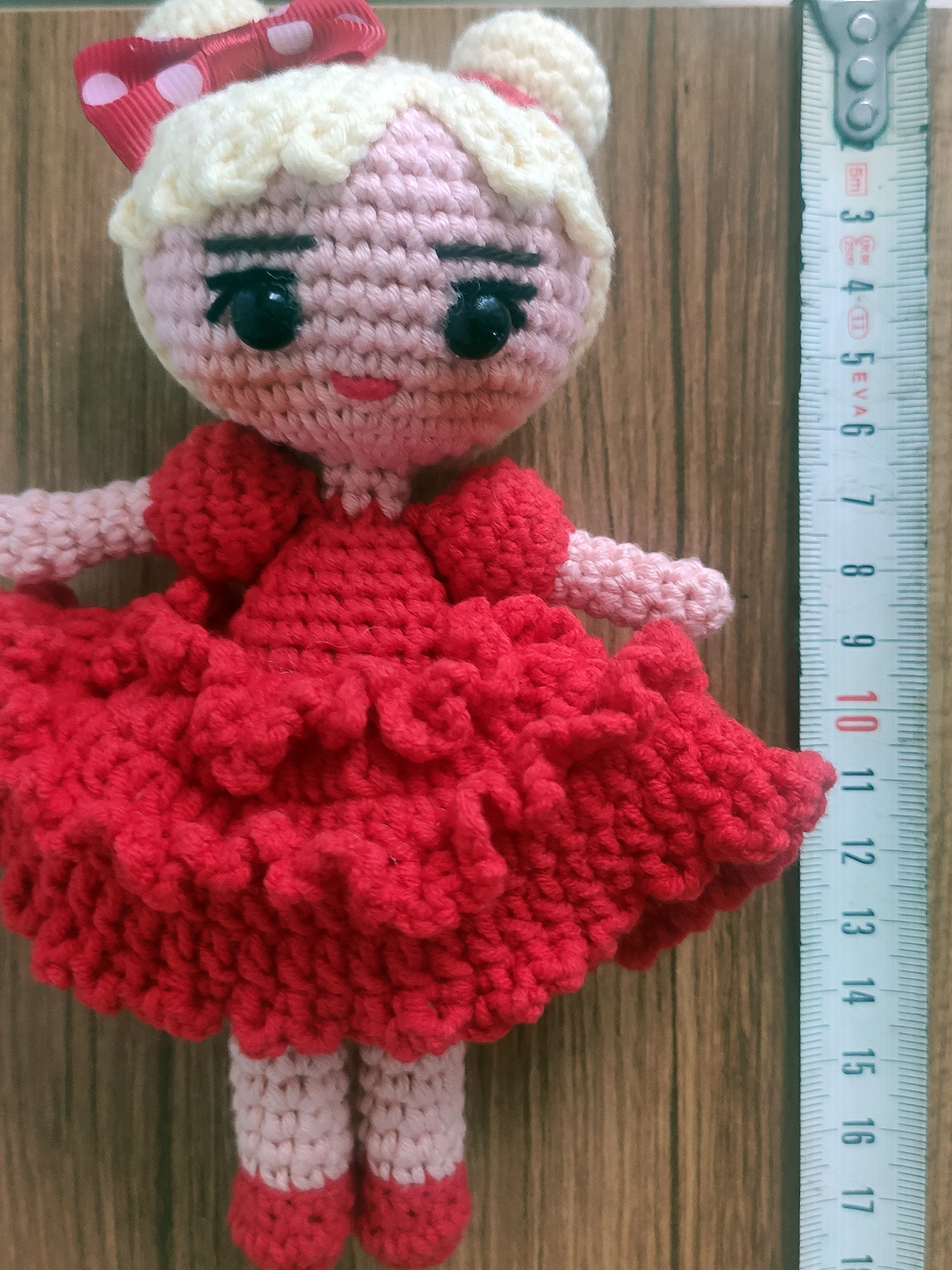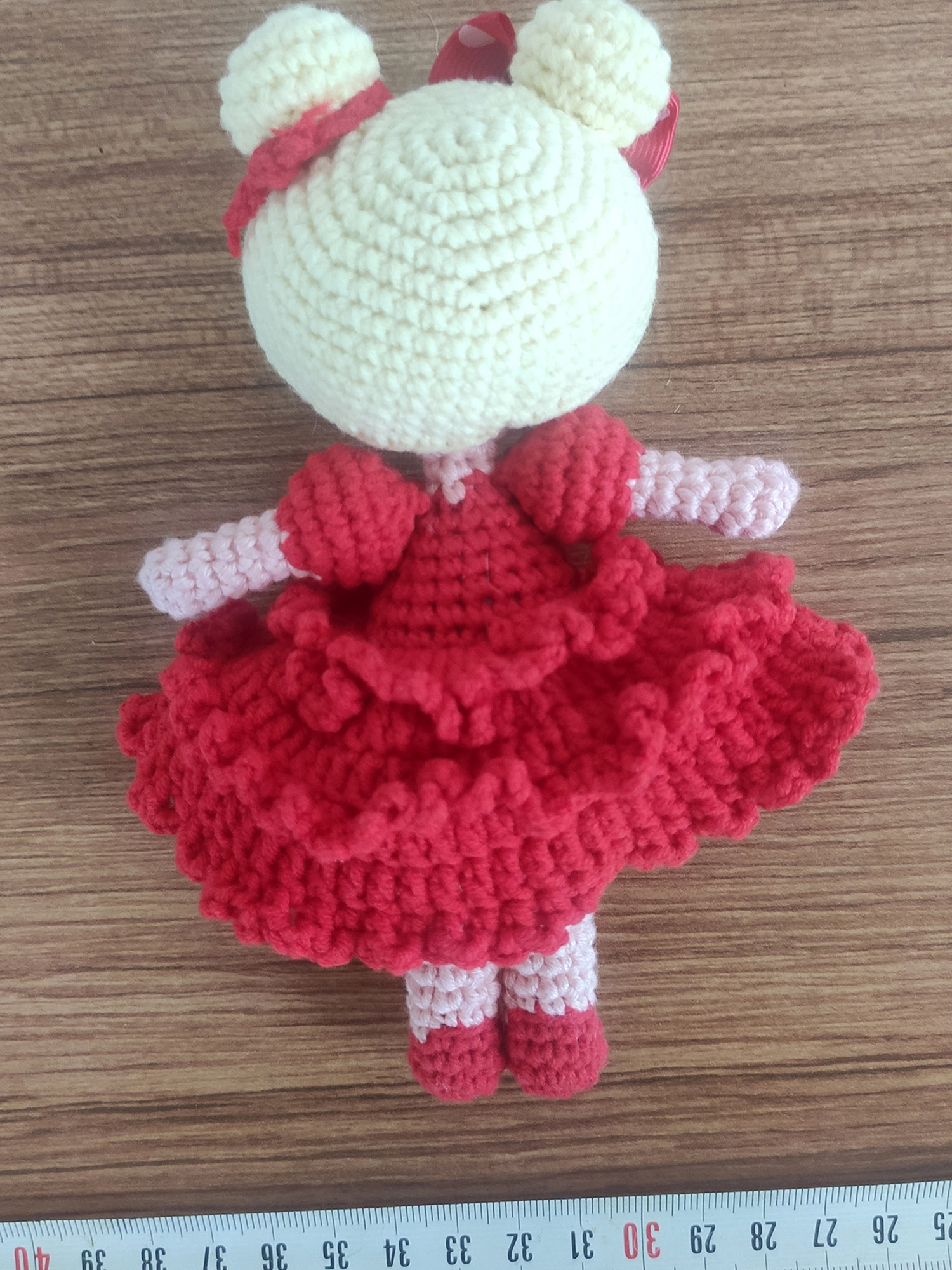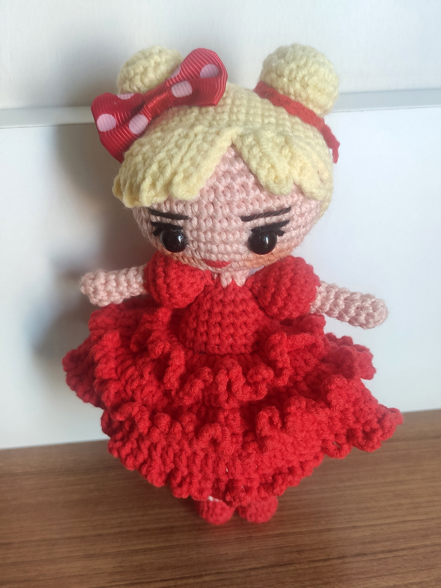 Tüm gözleri üzerine çeken, enerji dolu bir yıldız! Bu el yapımı amigurumi bebek, kendine has tarzı, fırfırlarla dolu gösterişli kırmızı elbisesi ve sevimli topuzlarıyla sadece bir oyuncak değil, aynı zamanda bir karakterdir. Her detayıyla neşe ve şıklık saçmak için özenle tasarlandı.