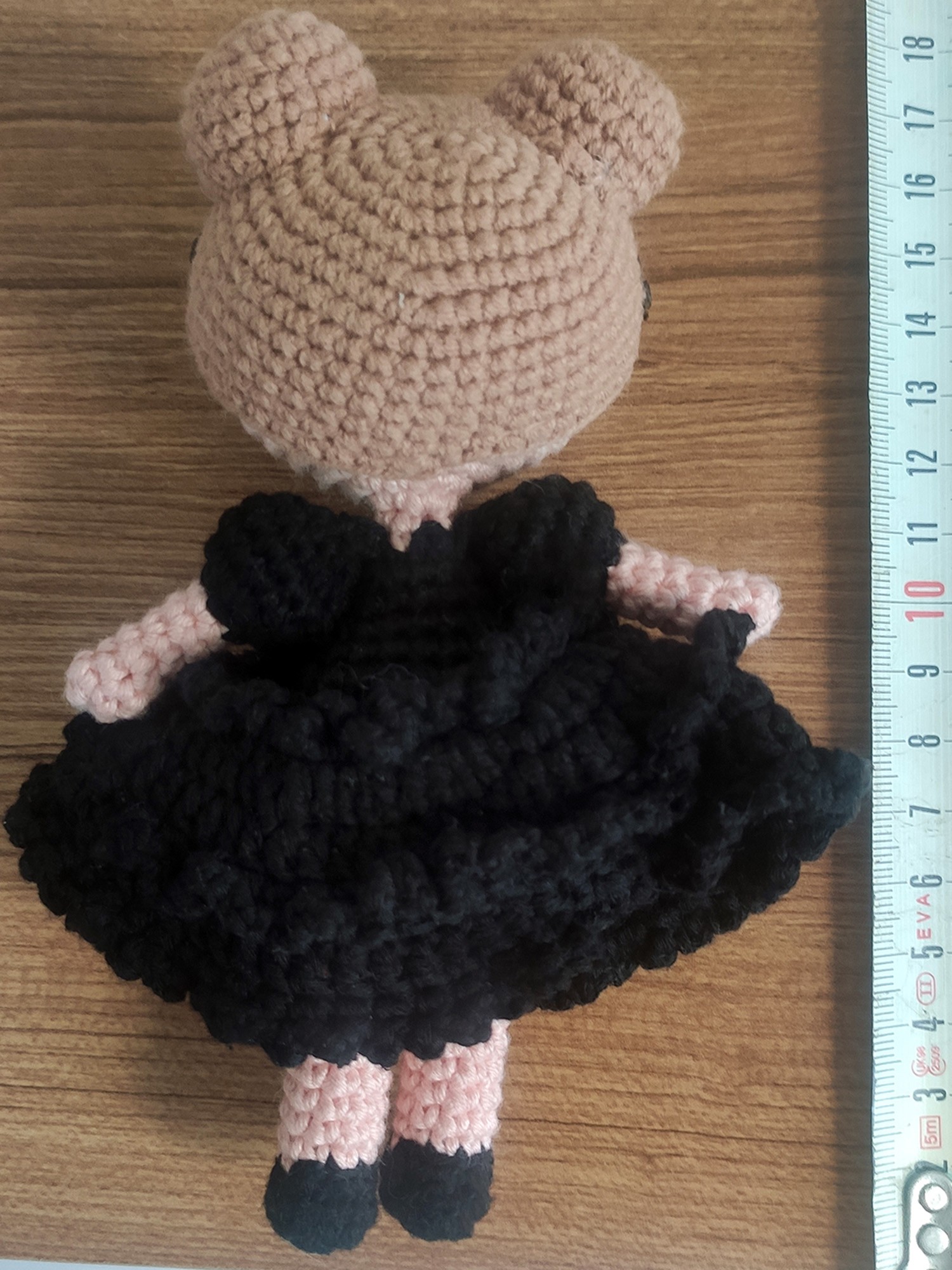 - Asil ve Zarif Tasarım: Bu bebek, şık topuz yapılmış kahverengi saçları, parıltılı siyah saç bandı ve en önemlisi, özel bir örgü tekniğiyle hazırlanmış kat kat, kabarık ve dokulu siyah elbisesiyle dikkat çeker. Yüzündeki zarif ifade, ona asil bir karakter kazandırır.