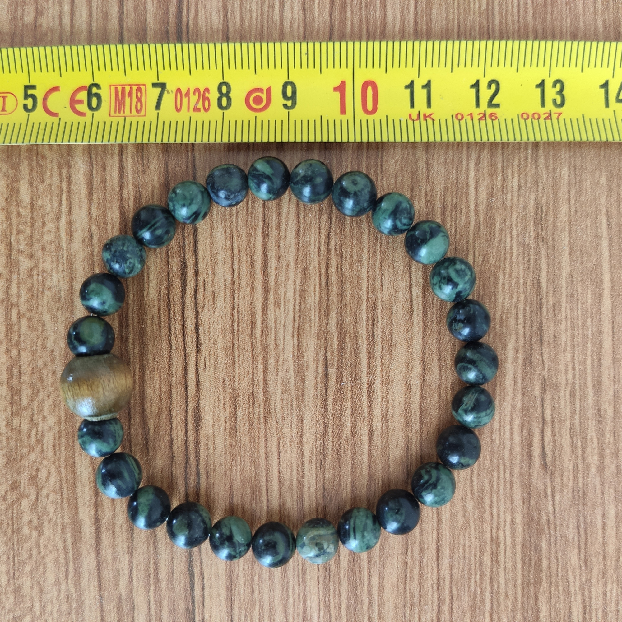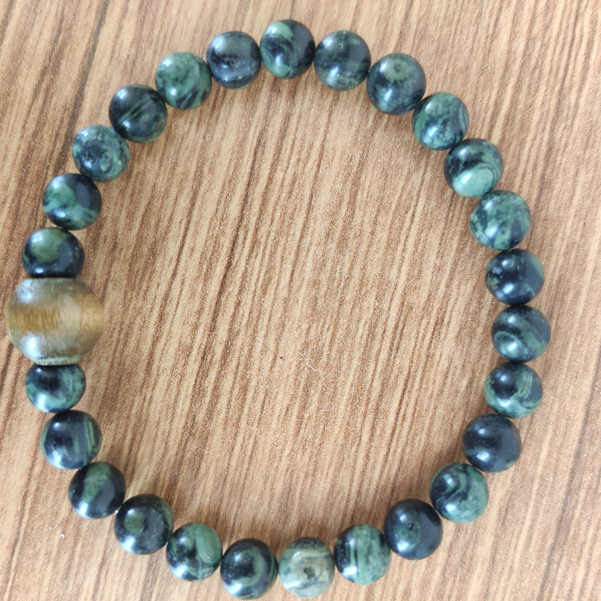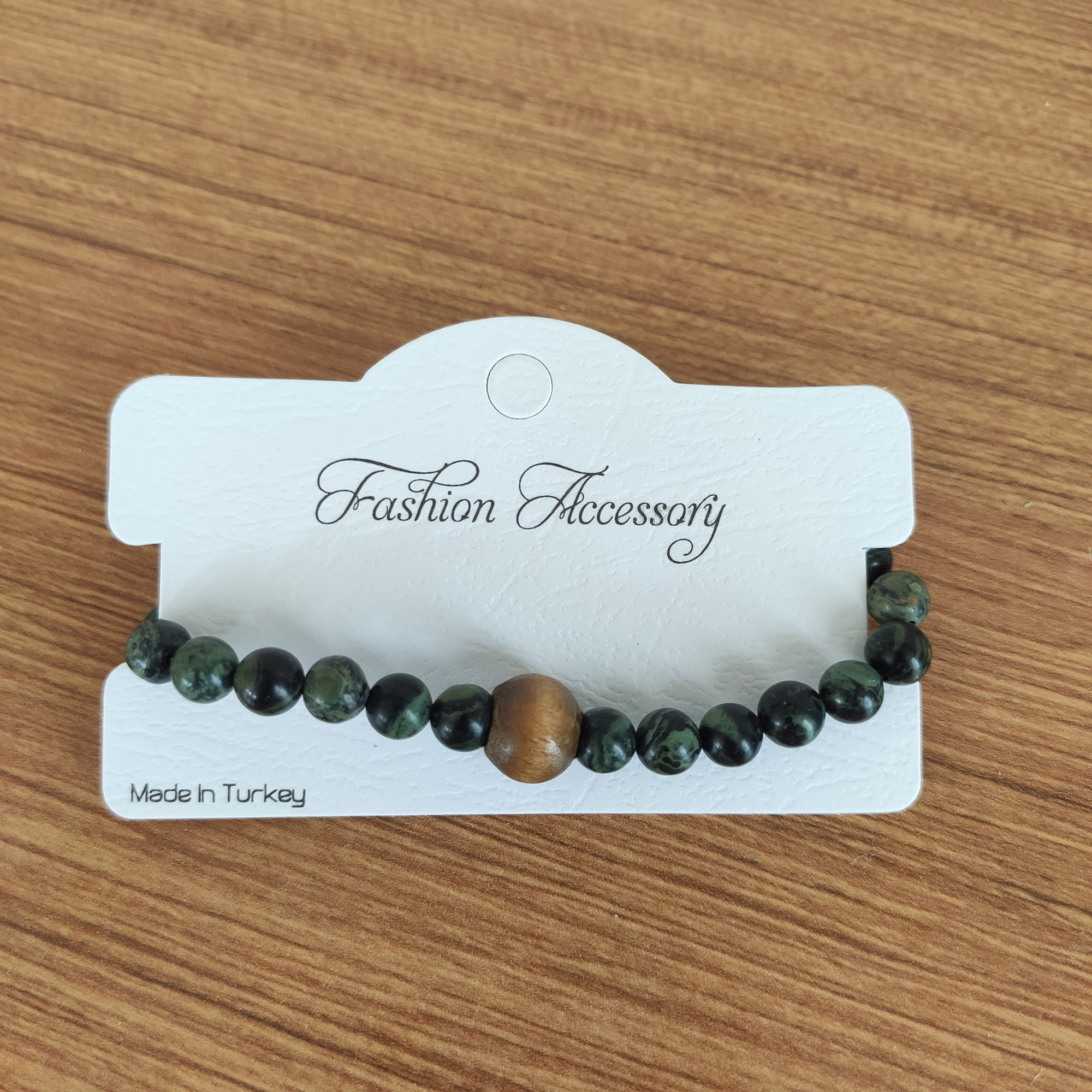 • Tasarım: Pürüzsüz Yeşim taşı boncukları, aralarına yerleştirilmiş zarif metal ara parçaları ve merkezi bir ahşap boncuk ile elastik bir misinaya dizilmiştir.